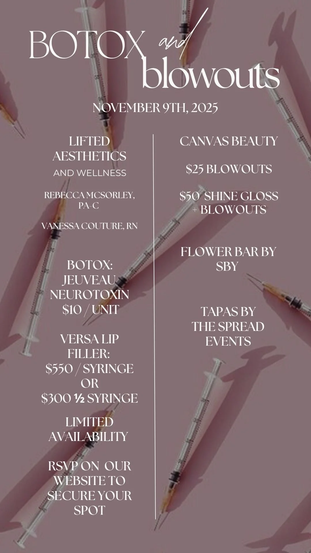 This private RSVP page is designed exclusively for our VIP clients who want early access to book Botox, lip filler, and blowout appointments before we open this event to the public.